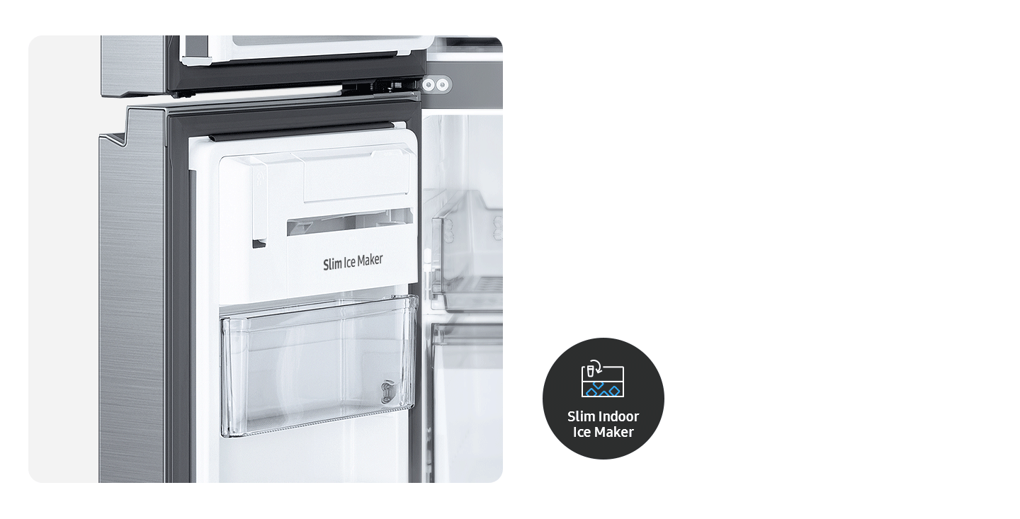 [صانع ثلج داخلي نحيف التصميم][قم بإخلاء مساحة أكبر لحفظ المزيد من الأطعمة، وفي الوقت نفسه اقتنِ المزيد من الثلج بفضل صانع الثلج الداخلي النحيف. فبما إنه مضمن في الباب، فإنه يمنحك مساحة حفظ أكبر عن طريق إخلاء مساحة الرف المشتمل عليها المجمد، ورغم ذلك يمكنك صنع قدر كبير من الثلج والاحتفاظ به. كما أن غطاءه البلاستيكي الشفاف يتيح لك رؤية ما تبقى من الثلج لديك.]