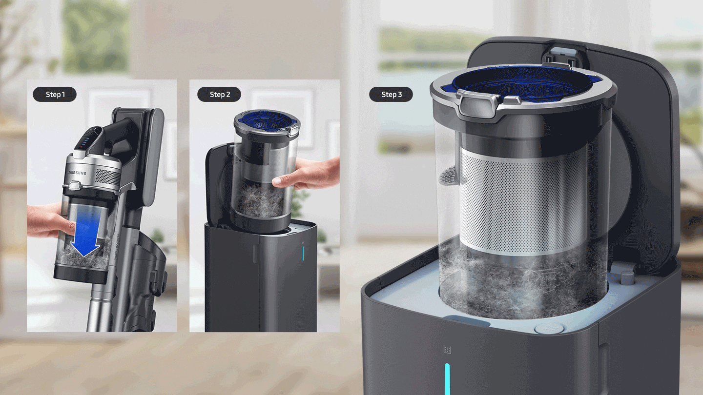[استمتع بالطريقة الأكثر راحةً وملاءمةً على الإطلاق لإفراغ حاوية الأتربة بمكنستك. كل ما عليك فعله هو فصل حاوية الأتربة عن المكنسة، ثم وضعها أعلى قاعدة التنظيف Cléá~ñ Stá~tíóñ~ التي ستقوم بدورها بإفراغ الأتربة من الحاوية بصورة أوتوماتيكية، دون أن تضطر إلى فصل الأنبوب أو الأسطوانة. وبالإضافة إلى ذلك، لن تكون هناك معاناة كبيرة في حال إفراغ الأتربة يدويًّا.]