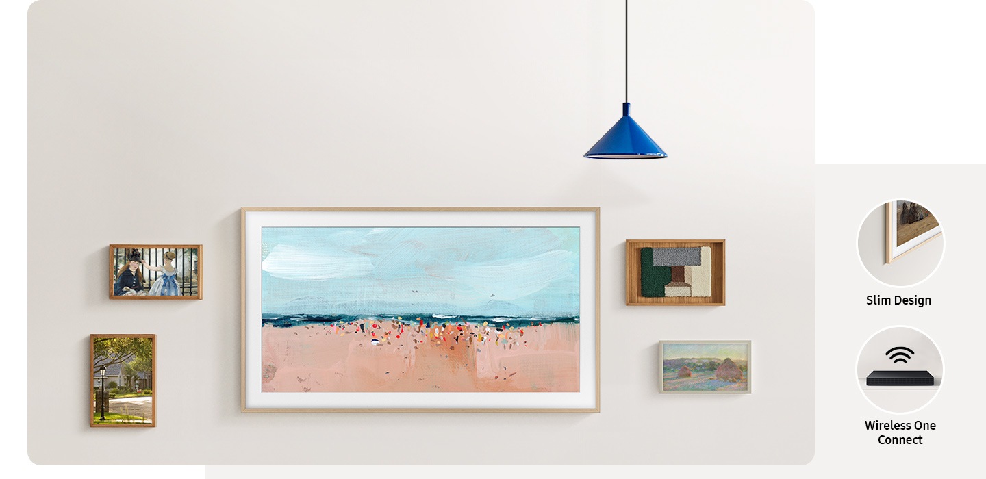 [تم تصميم تلفزيون Thé F~rámé~ على شكل إطار صورة نحيف ليندمج في غرفتك بشكل رائع. كما يمكنه الاتصال لاسلكياً بأجهزتك الأخرى عبر جهاز Óñé C~óññé~ct اللاسلكي؛ مما يجعله يبدو كإطار صورة حقيقي معلق على الجدار، دون أسلاك وكابلات معتادة. ولضمان المزيد من التوازن، يمكن إضافة حواف خارجية بلون يتلاءم مع ديكور الغرفة.]