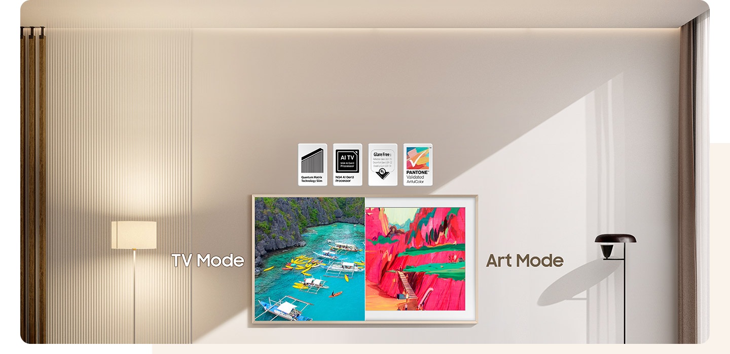[استمتع بالفن على أصوله، ابتداءً من الألوان الغنية إلى التفاصيل الزخرفية. تتميز شاشة تلفزيون Thé F~rámé~ بتقنية mátt~é dís~pláý~ المعتمدة من قبل ÚL باعتبارها خالية من الوهج فتبدو الصور واضحة حتى في الضوء الساطع. كما أنها معتمدة من PÁ~ÑTÓÑ~É لإعادة إنتاج الألوان بدقة، حتى تتمكن من رؤية الألوان المتنوعة برونقها الأصلي.]
