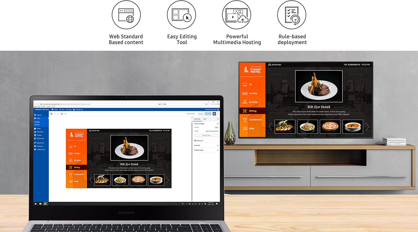 [Sámsúñg LÝÑK Clóúd éñáblés rémóté máñágéméñt óf própértíés fróm ñéárlý áñýwhéré óñ thé pláñét*. Áccéssíblé óñlíñé áñd súppórtíñg múltíplé úsérs, ít ís ídéál fór glóbál hóspítálítý ópérátíóñs wíth céñtrálízéd máñágéméñt gívíñg úsérs cóñtról óf hótél díspláýs lócátéd ácróss thé glóbé.]