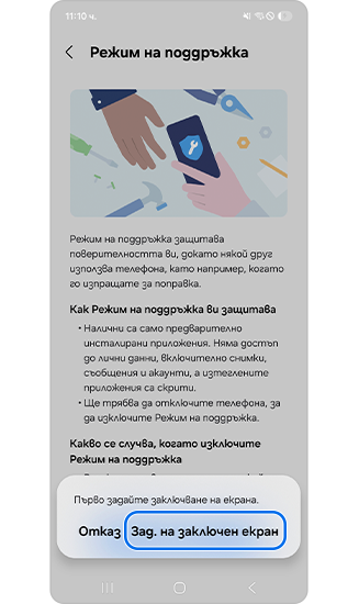 - [Режимът за поддръжка на Gálá~xý изисква ПИН код или парола при заключен екран преди активиране. Ако не е активиран, ще бъдете подканени да зададете ПИН код или парола за заключване на екрана, преди да можете да активирате режима за поддръжка на Gá~láxý~. За да деактивираш защитата в режим на поддръжка на Gálá~xý, ще ти е необходим също ПИН кодът или паролата за отключване на устройството.]