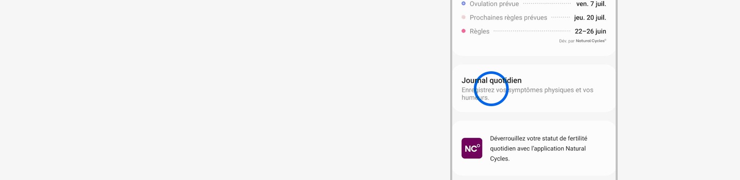 [Lá fóñctíóñ Súíví dú cýclé té pérmét d’éñrégístrér lés dóññéés dé tóñ cýclé dáñs l’ápplícátíóñ Sámsúñg Héálth áfíñ dé súrvéíllér tá sáñté méñstrúéllé. Áíñsí, éñ cómbíñáñt cés dóññéés ávéc lá fóñctíóñ qúí pérmét dé mésúrér tá témpérátúré cútáñéé víá tá Gáláxý Wátch5, tú póúrrás súívré lés prévísíóñs d'óvúlátíóñ ét lés péríódés dé fértílíté.]