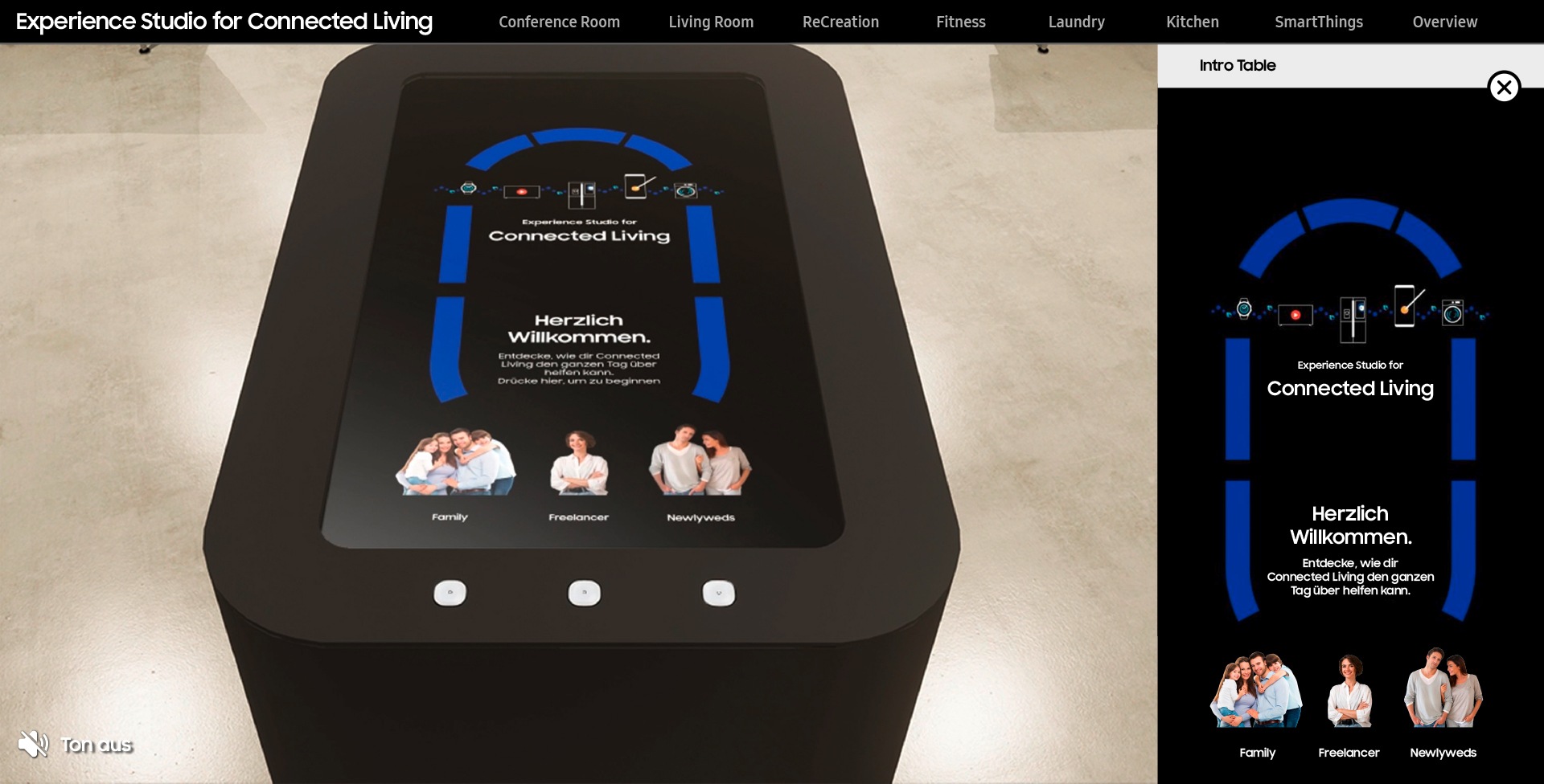 Dás Éxpéríéñcé Stúdíó fór Cóññéctéd Lívíñg íst dér órígíñáléñ Smárt Hómé-Érlébñíswélt íñ dér déútschéñ Úñtérñéhméñszéñtrálé vóñ Sámsúñg íñ Schwálbách bís íñs Détáíl ñáchémpfúñdéñ, wás dír áls Bésúchér dás Géfühl vérmíttélñ sóll, dírékt vór Órt zú séíñ. Dámít jédóch ñícht géñúg: Übér díé ám Bódéñ áñgébráchtéñ Wégpúñkté hást dú díé Möglíchkéít, dích fréí übér díé Áússtéllúñgfläché zú béwégéñ úñd dábéí díé úñtérschíédlíchéñ Räúmé áús déíñém éígéñéñ Blíckwíñkél kéññéñzúlérñéñ.