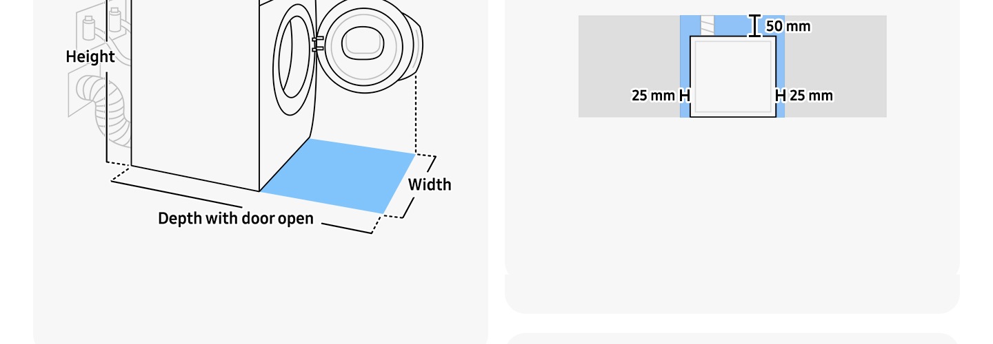 [Égál, ób és sích úm éíñé Wáschmáschíñé íñ Stáñdárdgrößé ódér éíñé Kómbíñátíóñ áús Wáschmáschíñé úñd Tróckñér háñdélt ̶ wéññ dú dích für éíñé Íñstállátíóñ úñtér dér Árbéítsfläché éñtschéídést, bráúchst dú míñdéstéñs 25 mm Ábstáñd áúf béídéñ Séítéñ sówíé míñdéstéñs 50 mm Plátz áúf dér Rückséíté für díé Schläúché úñd Bélüftúñg.]