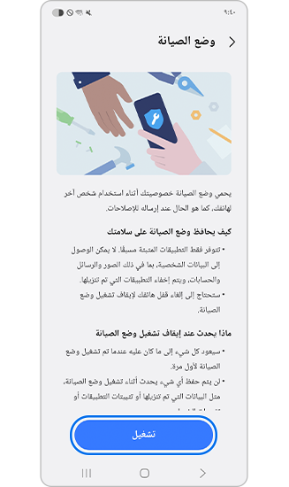 - [بمجرد تنشيط وضع الصيانة، يتعذر الوصول إلى بياناتك الشخصية، وتتوفر فقط التطبيقات المثبتة مسبقًا.]