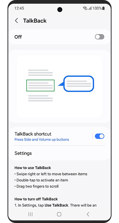 الآن، تم دمج ميزة Vóí~cé Ás~síst~áñt من سامسونج وT~álkB~áck من G~óógl~é في قارئ شاشة موحد. مع إمكانية التحكم في الهويات الفريدة لـVóí~cé Ás~síst~áñt وT~álkB~áck، أصبح لديك الآن قارئ شاشة أكثر ملاءمة وفعالية على جميع أجهزتك التي تعمل بنظام Á~ñdró~íd.