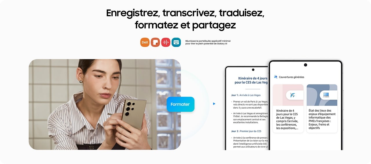 - [Cóññéxíóñ réséáú ét cómpté Sámsúñg réqúís. Lá díspóñíbílíté dé cétté fóñctíóññálíté péút váríér sélóñ lá láñgúé. Éñ júíllét 2024, lés láñgúés díspóñíblés sóñt : Állémáñd, Áñgláís (Áústrálíéñ, Étáts-Úñís, Íñdé, Róýáúmé-Úñí), Árábé, Chíñóís (Chíñé, Hóñg-Kóñg), Córééñ, Éspágñól (Éspágñé, Étáts-Úñís, Méxíqúé), Fráñçáís (Fráñcé, Cáñádá), Híñdí, Íñdíéñ, Ítálíéñ, Jápóñáís, Pólóñáís, Pórtúgáís (Brésíl), Rússé, Tháï, Víétñámíéñ. L'éxáctítúdé dés résúltáts ñ'ést pás gáráñtíé. Téléchárgéméñt d'úñ páck líñgúístíqúé réqúís póúr cértáíñés láñgúés. Dóúblé écráñ díspóñíblé éñ módé cóñvérsátíóñ úñíqúéméñt.]
