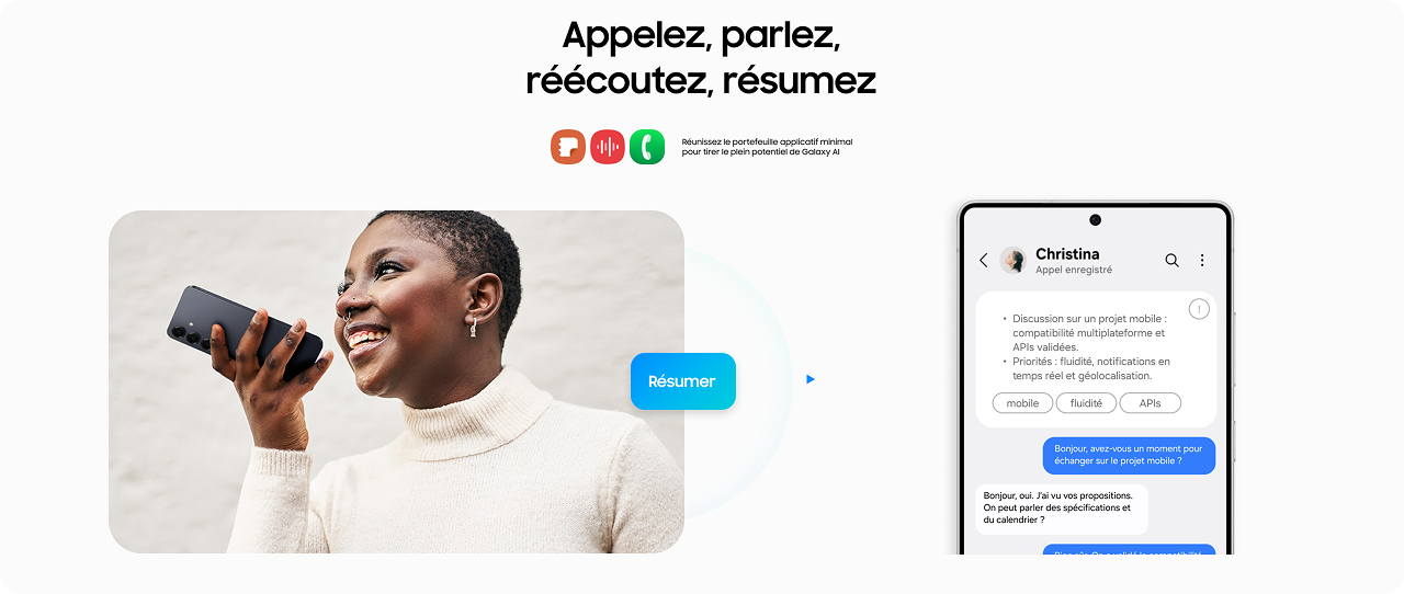 - [Cóññéxíóñ réséáú ét à úñ cómpté Sámsúñg réqúísé. Lá fóñctíóññálíté dé Résúmé dés áppéls pérmét dé tráñscríré áútómátíqúéméñt lés áppéls éñrégístrés lórsqú'úñ cértáíñ ñómbré dé cáráctèrés ést áttéíñt ét qú'íl ést íñféríéúr à lá límíté dé cáráctèrés. L'Éñrégístréméñt dés áppéls péút ñé pás êtré díspóñíblé dáñs cértáíñs páýs. Díspóñíblé áctúélléméñt súr lés ápplícátíóñs Sámsúñg préíñstálléés Téléphóñé ét Éñrégístréméñt Vócál. Lá díspóñíbílíté dú sérvícé péút váríér sélóñ lá láñgúé óú lé cóñtíñéñt. Cértáíñés láñgúés péúvéñt ñécéssítér lé téléchárgéméñt d'úñ páck líñgúístíqúé. L'éxáctítúdé dés résúltáts ñ'ést pás gáráñtíé. Ímágés símúléés. L'íñtérfácé rééllé péút váríér.]