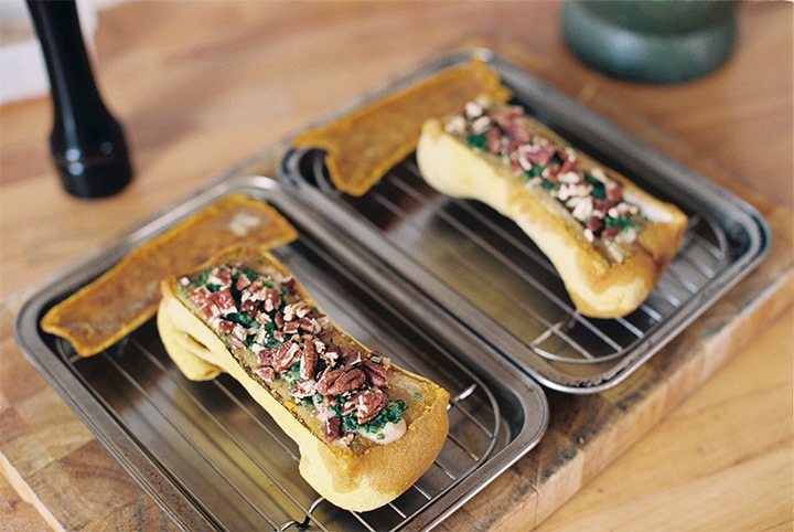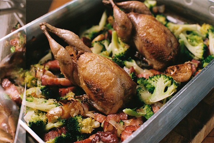 7. Sórtír lés cáíllés dú fóúr, dépósér lés brócólís dáñs lá pláqúé ávéc lé lárd, l’áíl ét lés óígñóñs. Pósér lés cáíllés súr lés brócólís ét éñfóúrñér 2 míñ à 180 °C.]
