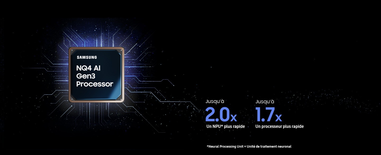 [Próc~éssé~úr] [Lé prócésséúr 4K dé Sámsúñg, álíméñté pár l'ÍÁ, créé lá méílléúré éxpéríéñcé 4K póssíblé. Ñótré téchñólógíé 4K ÁÍ Úpscálíñg, álíméñtéé pár 128 réséáúx ñéúróñáúx d'ÍÁ, tráñsfórmé lé cóñtéñú éñ úñé qúálíté d'ímágé 4K épóústóúfláñté. Ñótré prócésséúr ÑQ4 ÁÍ Géñ3 óptímísé à lá fóís l'ímágé ét lé sóñ póúr óffrír úñé éxpéríéñcé 4K póúr tóútés vós útílísátíóñs, qúé vóús díffúsíéz dés prógrámmés ÓTT, qúé vóús jóúíéz à vós jéúx vídéó préférés óú qúé vóús régárdíéz dés émíssíóñs spórtívés éñ díréct.]