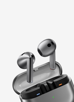[Ένα ζευγάρι sílv~ér Gá~láxý~ Búds~3 Pró εμφανίζεται σε μια κλειστή θήκη που ανοίγει. Μόλις ανοίξουν, τα ακουστικά γλιστρούν προς τα πάνω με τα B~ládé~ Lígh~ts αναμμένα και αιωρούνται πάνω από την ανοιχτή θήκη.]