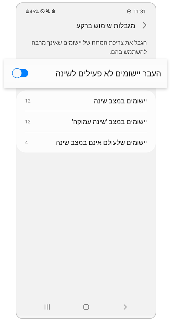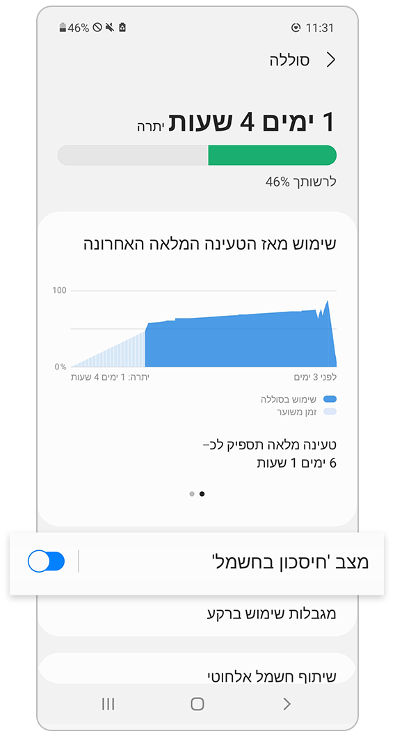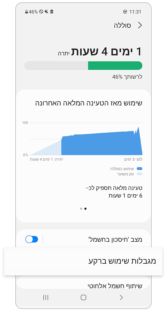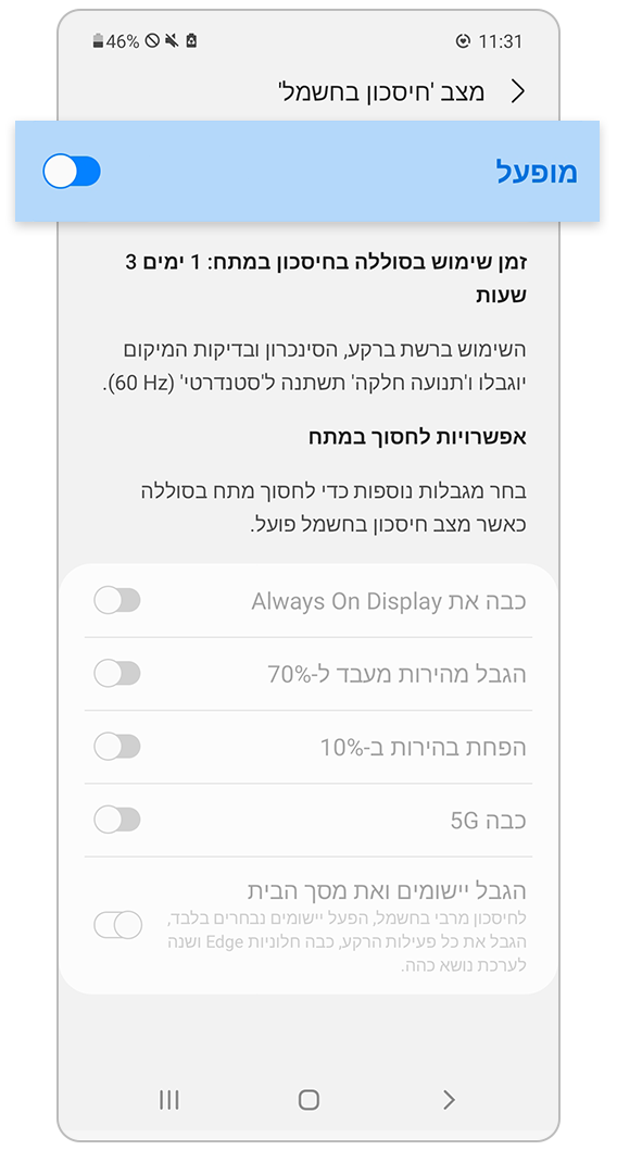 - [האפשרות 'חיסכון בחשמל' מגבילה את השימוש ברשת, בסנכרון נתונים, בפרטי מיקום ברקע.]
