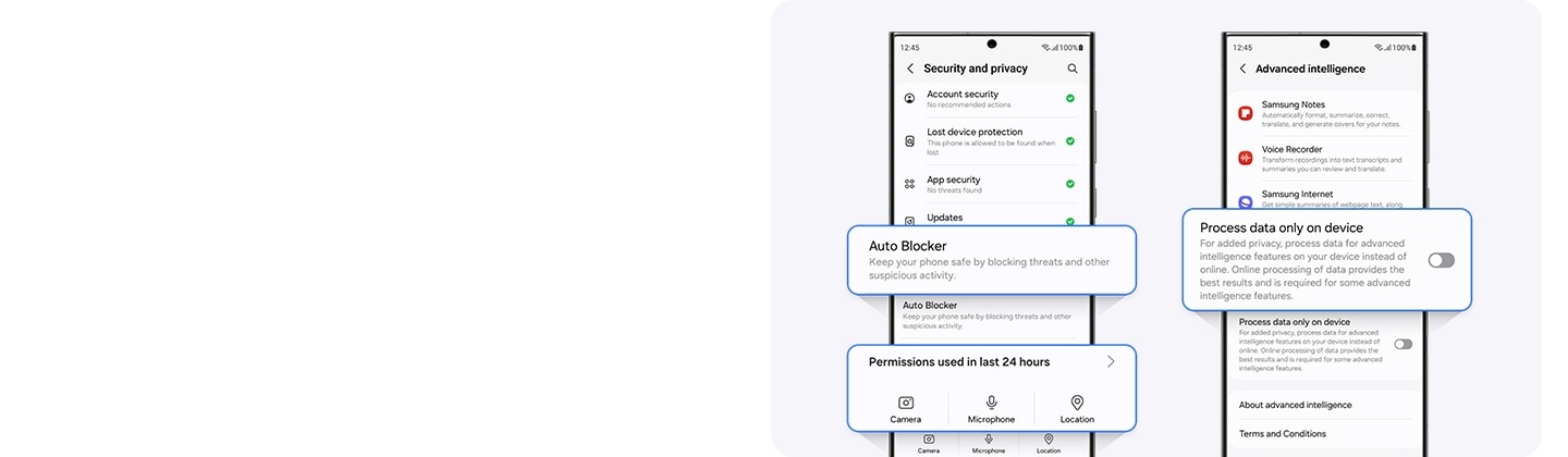 [در عصر هوشمصنوعی، Gálá~xý تجربه شخصیشدهای از کار با تلفن همراه را، بدون به خطر انداختن حریم خصوصی، ارائه کرده است. فناوریهای حریم خصوصی Sá~msúñ~g از اطلاعات شما محافظت میکند و کنترل کامل بر نحوه استفاده از آنها را در اختیار شما قرار میدهند.]