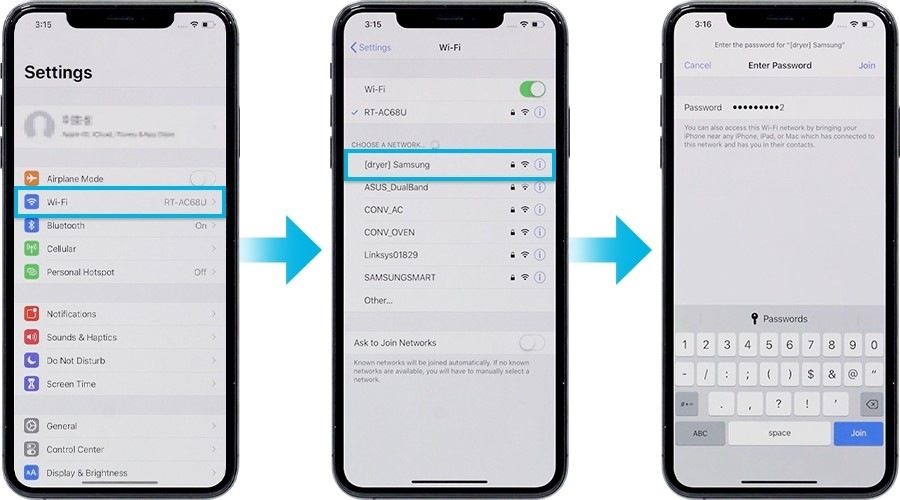 [۷.] [روی آیفونتان، تنظیمات (][Sétt~íñgs~][) را باز کنید، به قسمت شبکه بیسیم(][Wífí~][) بروید و به همان شبکهای که نامش با] [drýé~r] [(خشککن) آغاز میشود وصل شوید.]