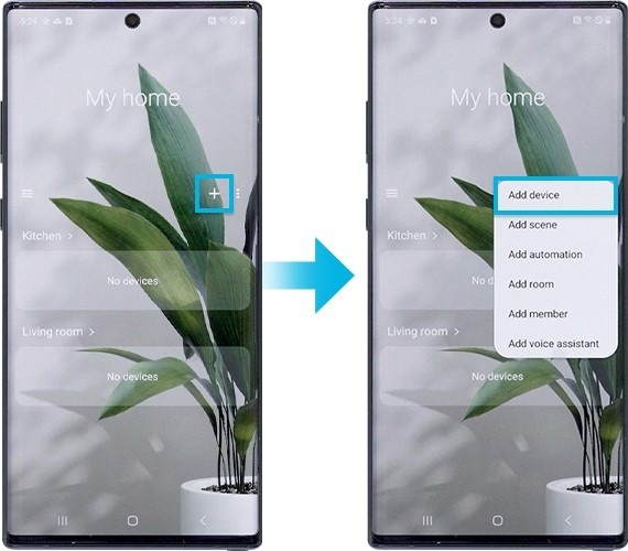 [٢.] [برنامه] SmartThings [را اجرا کنید.] [روی علامت مثبت (+) بزنید و در پنجره خانه گزینه افزودن دستگاه (][Ádd d~évíc~é]) [را انتخاب کنید.]