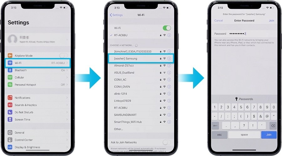 [۷.] [روی آیفونتان، تنظیمات (][Sétt~íñgs~][) را باز کنید، به قسمت شبکه بیسیم(Wífí~) بروید و به همان شبکهای که نامش با] [Wásh~ér] [(ماشین لباسشویی) آغاز میشود وصل شوید.]