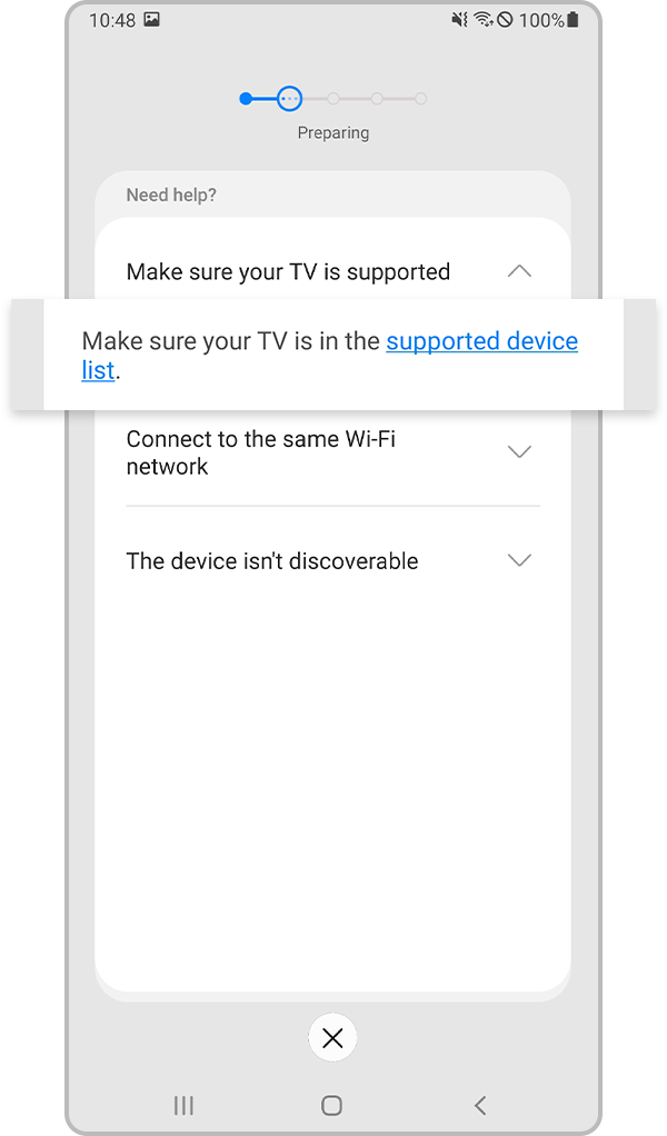 [هنگام اضافه کردن دستگاه از طریق شبکهی بیسیم (Wí-Fí~)، تلویزیون و گوشی هوشمند باید به شبکهی یکسانی وصل باشند. همچنین، برای جفت شدن گوشی هوشمند و تلویزیون، هر دو دستگاه باید به حساب کاربری سامسونگ یکسانی وارد شوند.]