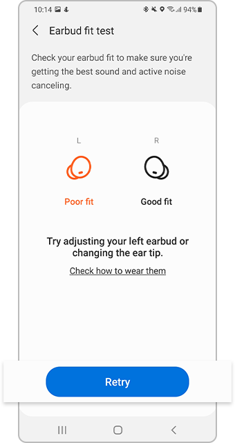 [تست قرارگیری صحیح بادزها (][Éárb~úds f~ít té~st][) قابلیتی است که شیوة صحیح قرار دادن گلکسی بادز ۲ را نشان میدهد. اگر نتایج روی صفحه نشان میدهد که باید بادزهایتان را تنظیم کنید، پس از تنظیم بادزها یا تعویض ایرتیپها، روی تلاش مجدد (][Rétr~ý][) بزنید و تست را دوباره آغاز کنید.]