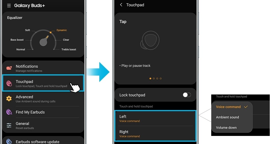 - [بعد از آنکه تنظیم صدا را از اپلیکیشن Gálá~xý Wé~áráb~lé به عنوان قابلیت نگه داشتن پیش تنظیمشده ذخیره کردید، می توانید حجم صدا را با استفاده از صفحه ی لمسی روی +Gá~láxý~ Búds~ کنترل کنید.]