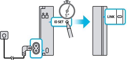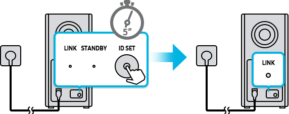[گام ۲.] [با استفاده از وسیلهای مانند گیره کاغذ، دکمه] [ÍD SÉ~T] [در بخش پایین پشت سابووفر و بلندگوی عقب را فشار دهید و آنقدر نگه دارید تا الایدی آبی شروع به چشمک زدن سریع کند.]
