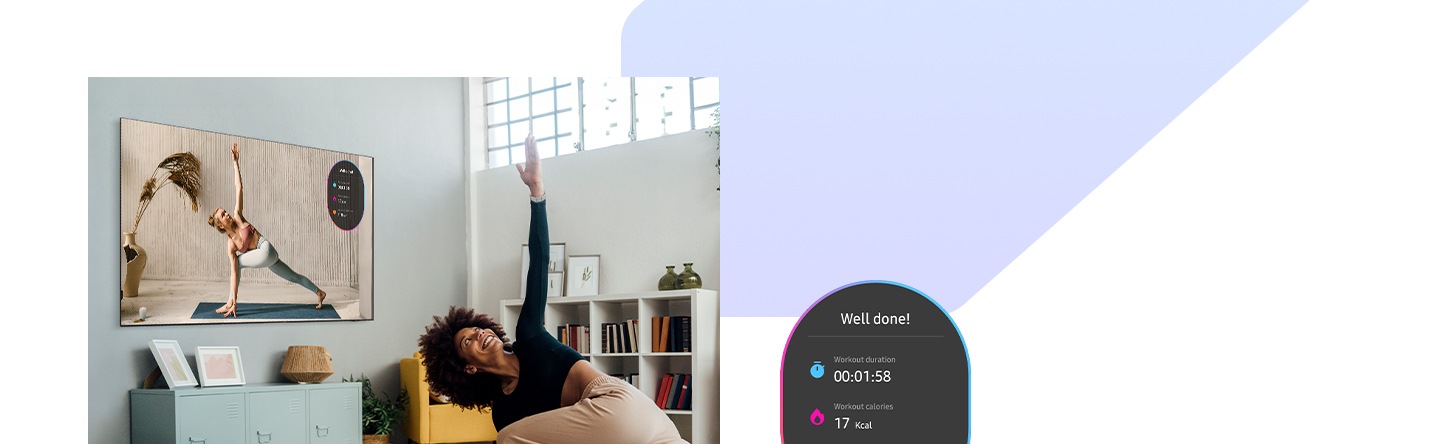[وضعیت پیشرفت ورزش و محتوای موردعلاقه خود را همزمان مشاهده کنید. کافی است دستگاه پوشیدنی خود را به تلویزیون وصل کنید تا دادههای لحظهای مانند سرعت تپش قلب و کالری مصرفشده روص صفحه ظاهر شود.]