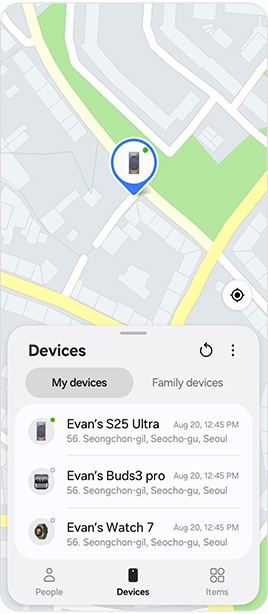 [Sáms~úñg F~íñdにログインする際に使用した同じS~ámsú~ñgアカウントでサインインしたデバイス ― Gá~láxý~スマートフォン、Gálá~xý Tá~bなど が「デバイス」タブに表示されます。さらに、Blú~étóó~th経由でメインデバイスに接続するウェアラブルデバイス ― Gá~láxý~ Búds~、Gálá~xý Wá~tch、G~áláx~ý Ríñ~g、S Pé~ñ Pró~なども表示されます。]