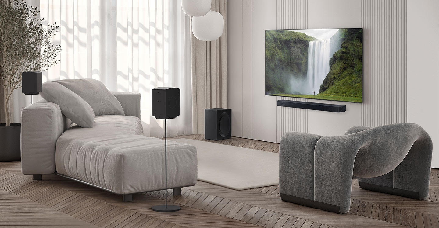 [Жеке артқы динамиктері бар саундбар үйде кинематографиялық әсер береді. Тыңдаушының артында және сол жағында және оң жағында орналасқан артқы динамиктер дыбыстық әсерлердің кеңістіктік орналасуын жақсарту үшін саундбармен жұптастырылған, бұл сіздің айналаңызда үш өлшемді көлемді дыбыс шығарады және сіз оқиғалардың ортасында жүргендей сезінесіз. Бұл үйдегі ойын-сауықтың максималды әсері.]