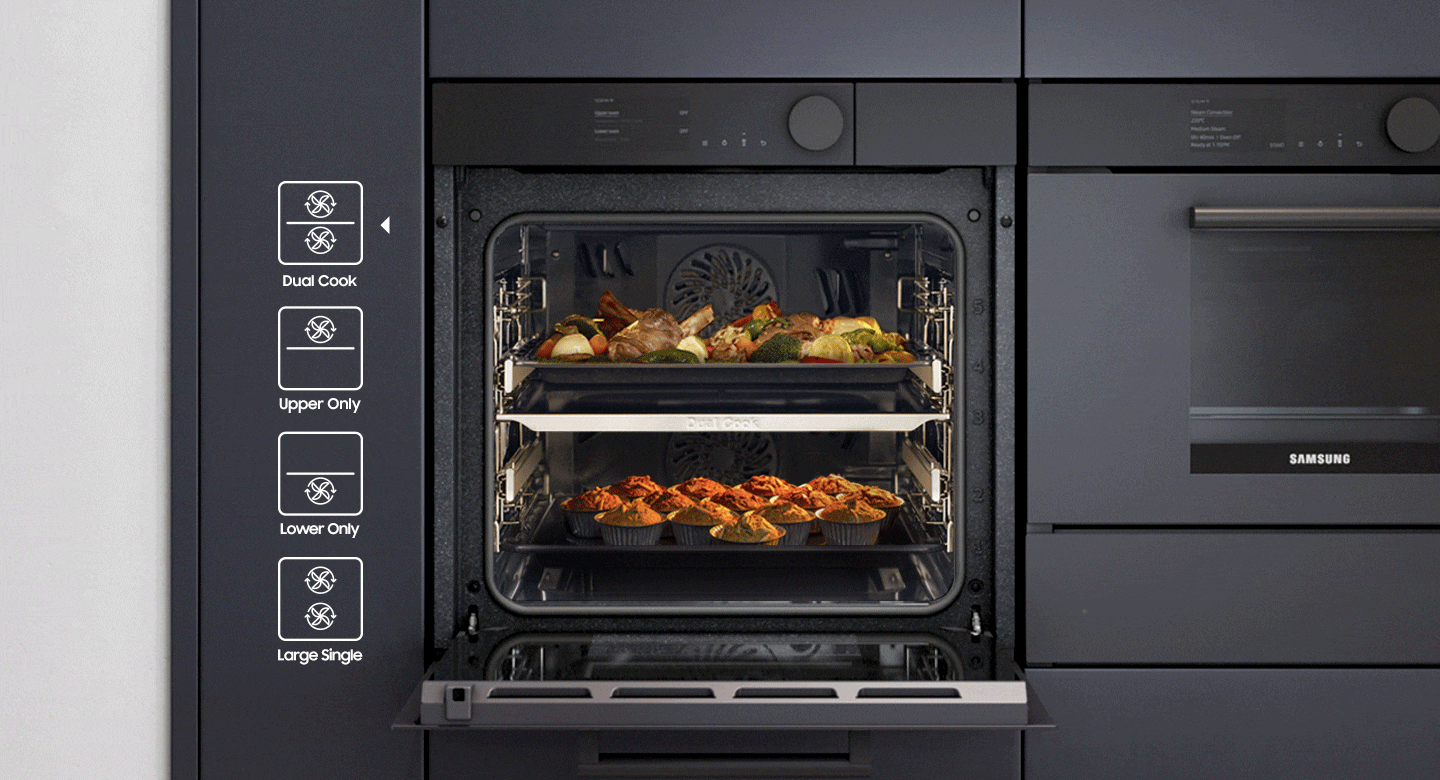 [Әртүрлі көлемді тағамдарды әзірлеу әдісін таңдаңыз, уақыт пен энергия үнемдеңіз. Dúál~ Cóók~ жүйесінің бір-бірінен тәуелсіз немесе бірге жұмыс істейтін тамақ пісіретін жоғарғы және төменгі аймағы бар. Бір аймақты шағын тағам әзірлеуге пайдаланыңыз немесе әртүрлі тағам әзірлеу үшін екі аймақ құрыңыз. Үлкен тағамдарды әзірлеу үшін пешті түгелдей пайдалануға болады.]