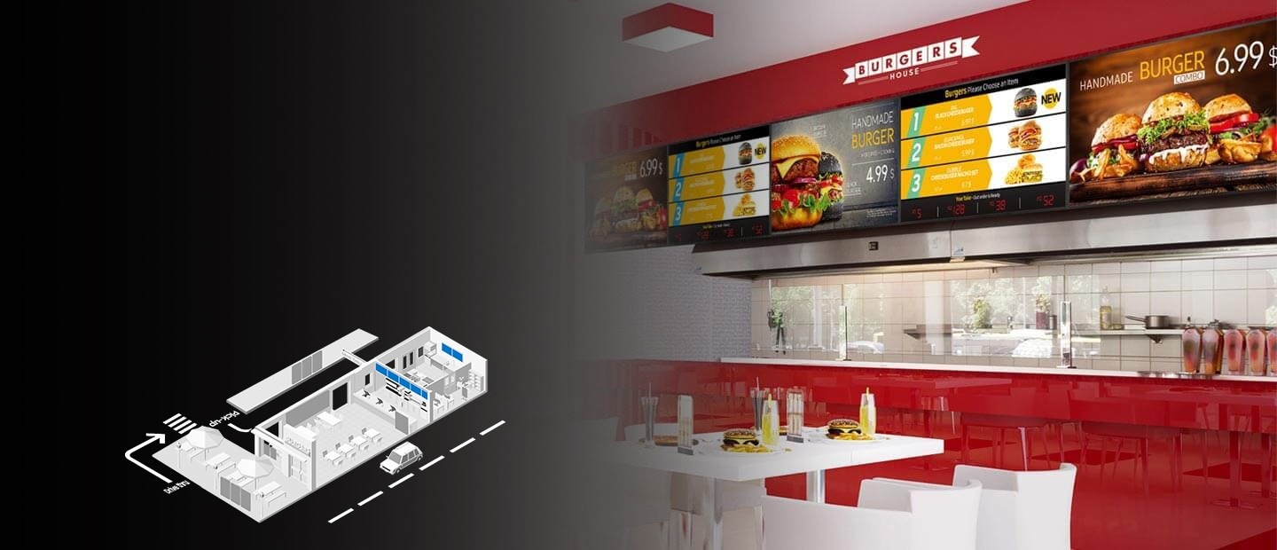 [Ресторанам быстрого обслуживания, чтобы выделяться среди конкурентов и повышать качество обслуживания клиентов, необходимо улучшать презентацию меню и услуг. Цифровые дисплеи могут помочь удовлетворить эти требования с помощью ярких изображений и точной информации.]