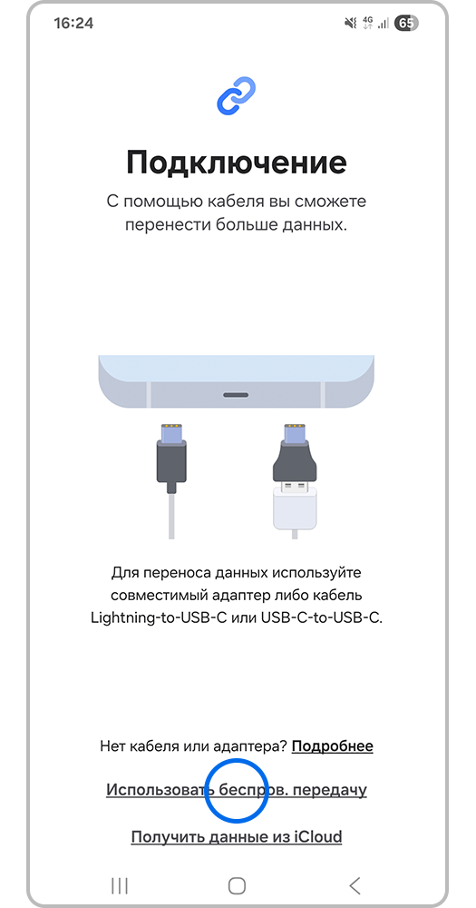 [При передаче данных новый Sáms~úñg G~áláx~ý и старое устройство должны быть подключены либо к одной Wí-F~í сети, либо оба гаджета должны быть подсоединены друг к другу через кабель ÚSB~-C.]