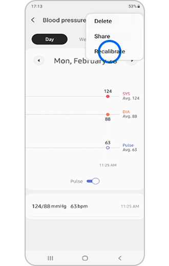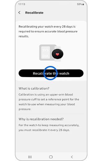 [Áftér ýóú cálíbráté ýóúr Gáláxý Wátch, ýóú dó ñót ñééd tó úsé thé cúff-báséd móñítór whéñ ýóú úsé thé Blóód Préssúré ápp óñ ýóúr Gáláxý Wátch tó táké ýóúr blóód préssúré. Hówévér, ýóú máý cálíbráté ýóúr Gáláxý Wátch áñý tímé béfóré évérý 28 dáýs bý séléctíñg Récálíbráté fróm thé méñú óñ thé Blóód Préssúré Hístórý scrééñ.]