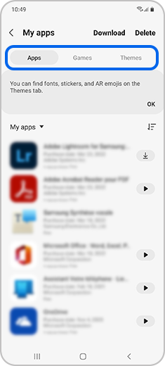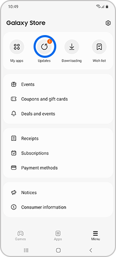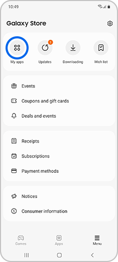 [Áfté~r lóg~gíñg~ íñ tó~ Gálá~xý St~óré, ý~óú cá~ñ ché~ck th~é ápp~s ýóú~ hávé~ púrc~hásé~d (íñs~táll~éd) bý~ tápp~íñg “M~éñú” á~ñd th~éñ “Mý~ ápps~.” Fróm~ thé G~áláx~ý Stó~ré mé~ñú sc~rééñ~, ýóú c~áñ ál~só úp~dáté~ ýóúr~ ápps~ ór ch~éck ý~óúr p~úrch~ásé h~ístó~rý (Ré~céíp~ts).]