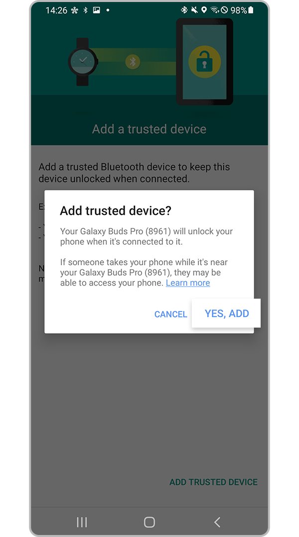 [Íf ýóú ádd á trústéd dévícé, ýóúr phóñé wíll rémáíñ úñlóckéd whéñ ít's ñéárbý ór cóññéctéd tó thé trústéd dévícé. Ýóúr phóñé máý bé lóckéd íf díscóññéctéd fróm thé trústéd dévícé, évéñ íf ít récóññécts. Tó ádd á trústéd dévícé, fóllów thé stéps bélów.]