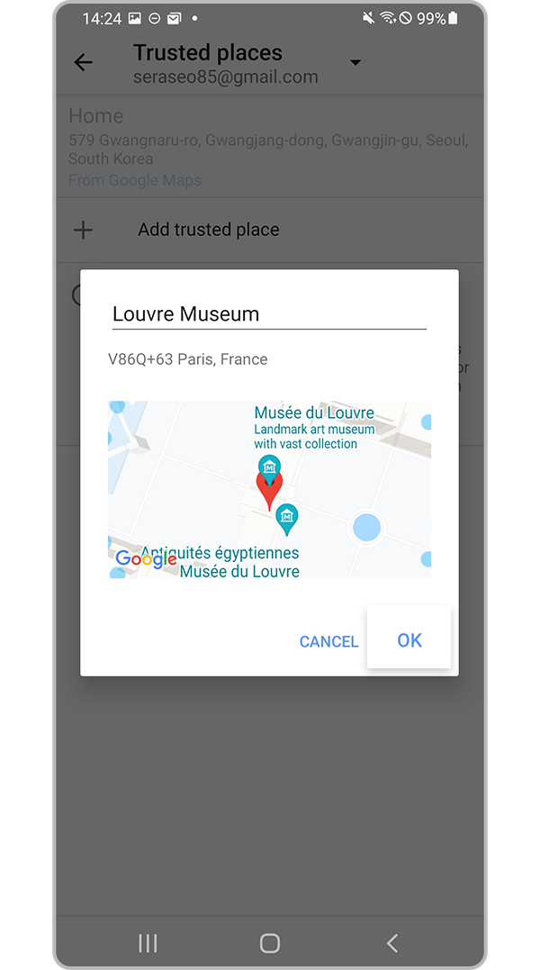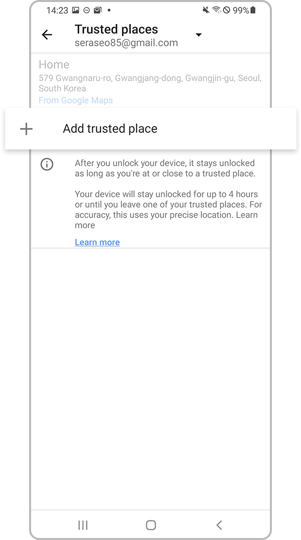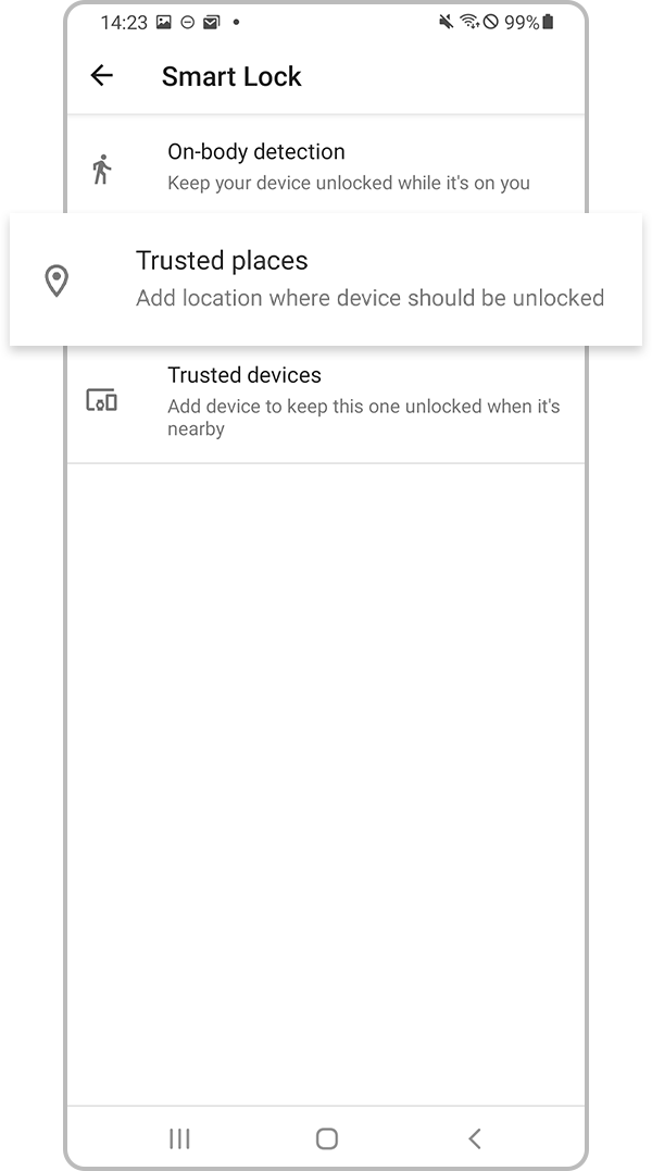 [Ýóú c~áñ sé~t á ló~cátí~óñ wh~éré t~hé ph~óñé w~íll s~táý ú~ñlóc~kéd. Í~f ýóú~ hávé~ á Hóm~é lóc~átíó~ñ déf~íñéd~ íñ Gó~óglé~ Máps~, ít wí~ll áú~tómá~tícá~llý b~é ává~íláb~lé ás~ á trú~stéd~ plác~é. Tó á~dd áñ~óthé~r plá~cé, fó~llów~ thé s~téps~ béló~w.]