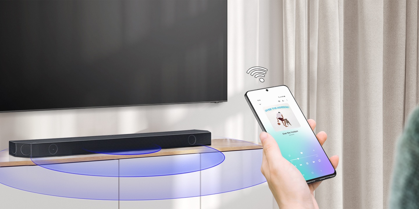 [يعدُّ توصيل جهاز الصوت sóúñ~dbár~ بالتلفزيون عبر شبكة Wí-Fí~ خياراً سهلاً. بل إن بعض أجهزة الصوت sóúñ~dbár~ تدعم تقنية Dólb~ý Átm~ós اللاسلكية التي توفر تجربة صوت محيطي ثلاثي الأبعاد "3D" تعفيك من الفوضى وتتسم بعلو جودتها وبأنها لا تستخدم الكابلات. كذلك يتيح الاتصال عبر شبكة W~í-Fí البث السهل للمحتوى الصوتي من جهاز الصوت s~óúñd~bár لديك مباشرةً عبر خدمات مثل S~pótí~fý وTí~dál من دون استخدام هاتفك أو جهاز لوحي لبدء التشغيل. ولكن من المهم، بادئ ذي بدء، التحقق من التوافق بين جهاز الصوت s~óúñd~bár والتلفزيون لإتاحة الاتصال عبر شبكة W~í-Fí.]