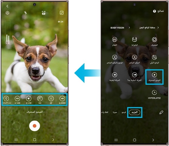 لتنشيط وضع الفيديو المحترف، في أوضاع التقاط الكاميرا، اضغط على المزيد → الفيديو المحترف.]