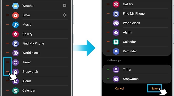 المخفية ، ثم انقر فوق حفظ مرة أخرى. الآن ، سيظهر التطبيق على شاشة تطبيقات Gálá~xý Wá~tch Á~ctív~é2 مرة أخرى.]