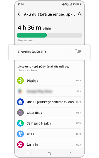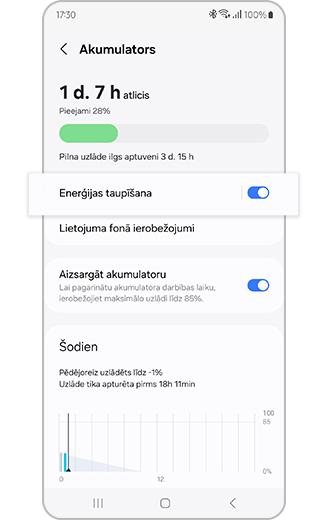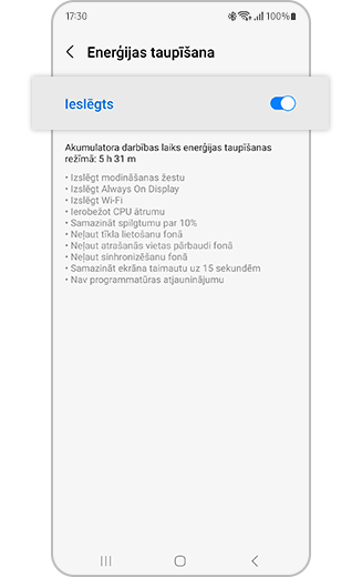 Já ír íéspējóts réžīms “Éñérģíjás táúpīšáñá”, ñólūkā ñódróšíñāt ílgākú ákúmúlátórá dárbībás láíkú fóñá prógrámmás ñéízmáñtós Wí-Fí úñ móbílós dátús, kā árī tíks átspējótás tādás fúñkcíjás kā Álwáýs Óñ Díspláý, kás pátērē dáúdz ákúmúlátórá éñérģíjás.