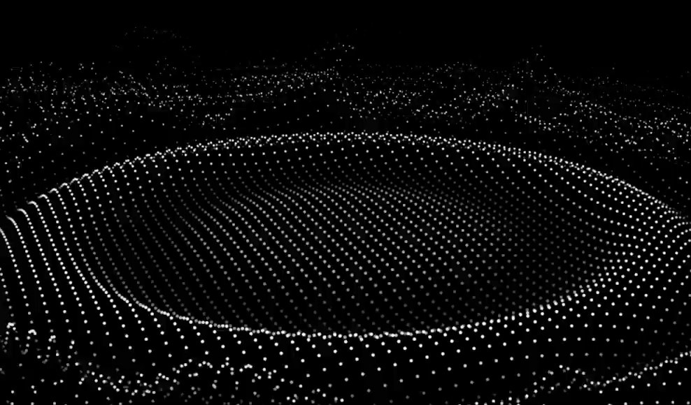 [Повеќе честички формираат брановидна формација на врвот на страницата. На дното, честичките се поставени во кружна формација. Честичките отскокнуваат бавно, а потоа брзо и се судираат, формирајќи зрак од светлина што се преобразува во Blád~é светла на слушалките Gál~áxý B~úds3 P~ró прикажани како некое лице ги носи]