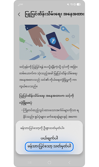 [ပြင်ဆင်ထိန်းသိမ်းခြင်းအစီအမံသည် အခြားသူတစ်ယောက်က သင်၏ဖုန်းကိုပြင်ဆင်နေချိန် (ဥပမာ ဖုန်းပြင်ရန်ဆိုင်သို့ပို့ဆောင်ထားစဉ်) တွင် သင်၏ကိုယ်ရေးကိုယ်တာလုံခြုံရေးကို ကာကွယ်ပေးပါသည်။ ၎င်းကိုယ်ရေးကိုယ်တာလုံခြုံရေးစနစ်အသစ်သည် သင့်ထံတွင်သင့်ဖုန်းမရှိစဉ်ကာလအတွင်း သင့်အချက်အလက်များကို ဝင်ရောက်ကြည့်ရှုခြင်းမပြုနိုင်စေရန် ပိတ်ပင်ထားခြင်းကြောင့် သင်အပြည့်အဝစိတ်ချထားနိုင်ပါသည်။ ပြင်ဆင်ထိန်းသိမ်းခြင်းအစီအမံအတွင်း၌ ဓါတ်ပုံများ၊ စာတိုများ၊ အကောင့်များအပါအဝင်သင့်ကိုယ်ရေးကိုယ်တာအချက်အလက်များကို ဝင်ရောက်ကြည့်ရှုနိုင်မည်မဟုတ်ဘဲ ကြိုတင်သွင်းထားသည့် အက်(ပ်)များကိုသာ တွေ့နိုင်မည်ဖြစ်ပါသည်။ ပြင်ဆင်ထိန်းသိမ်းခြင်းအစီအမံကိုပိတ်ရန်အတွက် သင့်ဖုန်းကိုဖွင့်ရန်လိုအပ်မည်ဖြစ်ပါသည်။]
