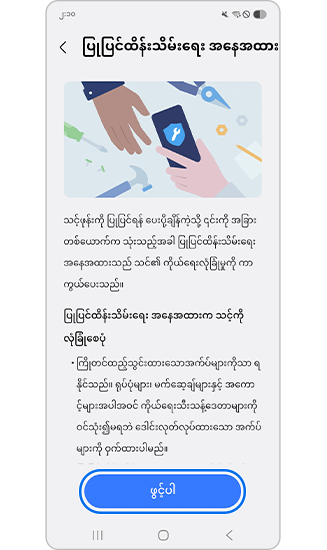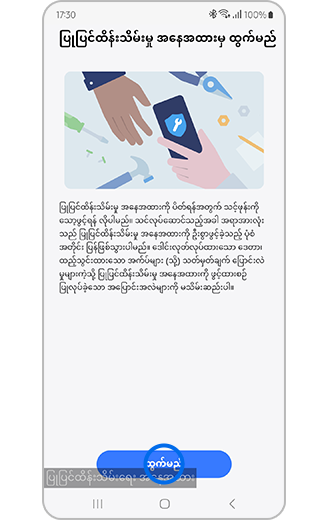 - [Áñdr~óíd 13 သို့မဟုတ် ၎င်းထက်မြင့်သောဗားရှင်းကို အသုံးပြုထားသော G~áláx~ý ဖုန်းများတွင် ပြုပြင်ထိန်းသိမ်းခြင်းစနစ်ကို အထောက်အပံ့ပေးထားမည်ဖြစ်ပါသည်။]