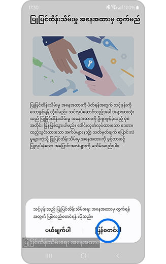 - [ပြုပြင်ထိန်းသိမ်းခြင်းအစီအမံ စတင်သည်နှင့်တပြိုင်နက် သင့်ကိုယ်ရေးကိုယ်တာအချက်အလက်များကို ကြည့်ရှုနိုင်တော့မည်မဟုတ်ဘဲ ကြိုတင်သွင်းထားသော အက်(ပ်)များကိုသာ အသုံးပြုနိုင်မည်ဖြစ်ပါသည်။]