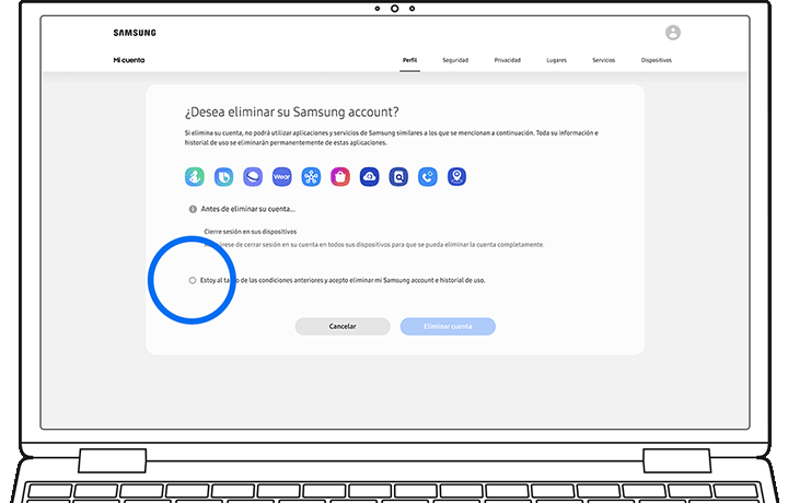 [Ñótá: Cúáñdó élímíñés tú cúéñtá Sámsúñg, tús dátós támbíéñ sé élímíñáráñ dé tódós lós sérvícíós dé Sámsúñg cóñéctádós á tú cúéñtá. Ádémás, támbíéñ sé élímíñárá tódá lá íñfórmácíóñ qúé pértéñécé á tú cúéñtá, cómó éléméñtós déscárgádós, hístóríál dé cómprás, étc.]