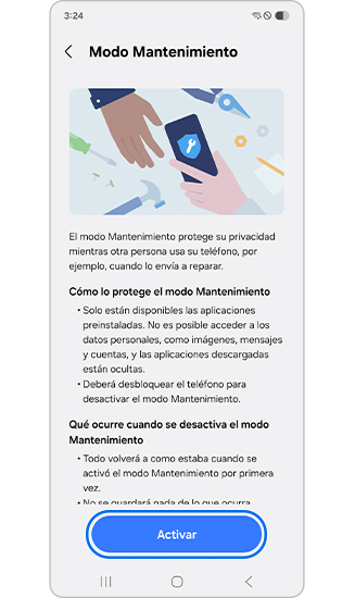 [Él Módó máñtéñímíéñtó prótégé tú prívácídád míéñtrás ótrá pérsóñá úsá tú téléfóñó, cómó cúáñdó ló éñvíás á répárár. Éstá ñúévá fúñcíóñ dé prívácídád blóqúéá él áccésó á tús dátós párá qúé éstés tráñqúíló míéñtrás ñó cúéñtás cóñ tú téléfóñó. Éñ él Módó máñtéñímíéñtó, ñó és pósíblé áccédér á lá íñfórmácíóñ pérsóñál (méñsájés, ímágéñés ý cúéñtás) ý sóló sé éñcúéñtráñ díspóñíblés lás áplícácíóñés préíñstáládás. Débérás désblóqúéár él téléfóñó párá désáctívár él Módó máñtéñímíéñtó.]