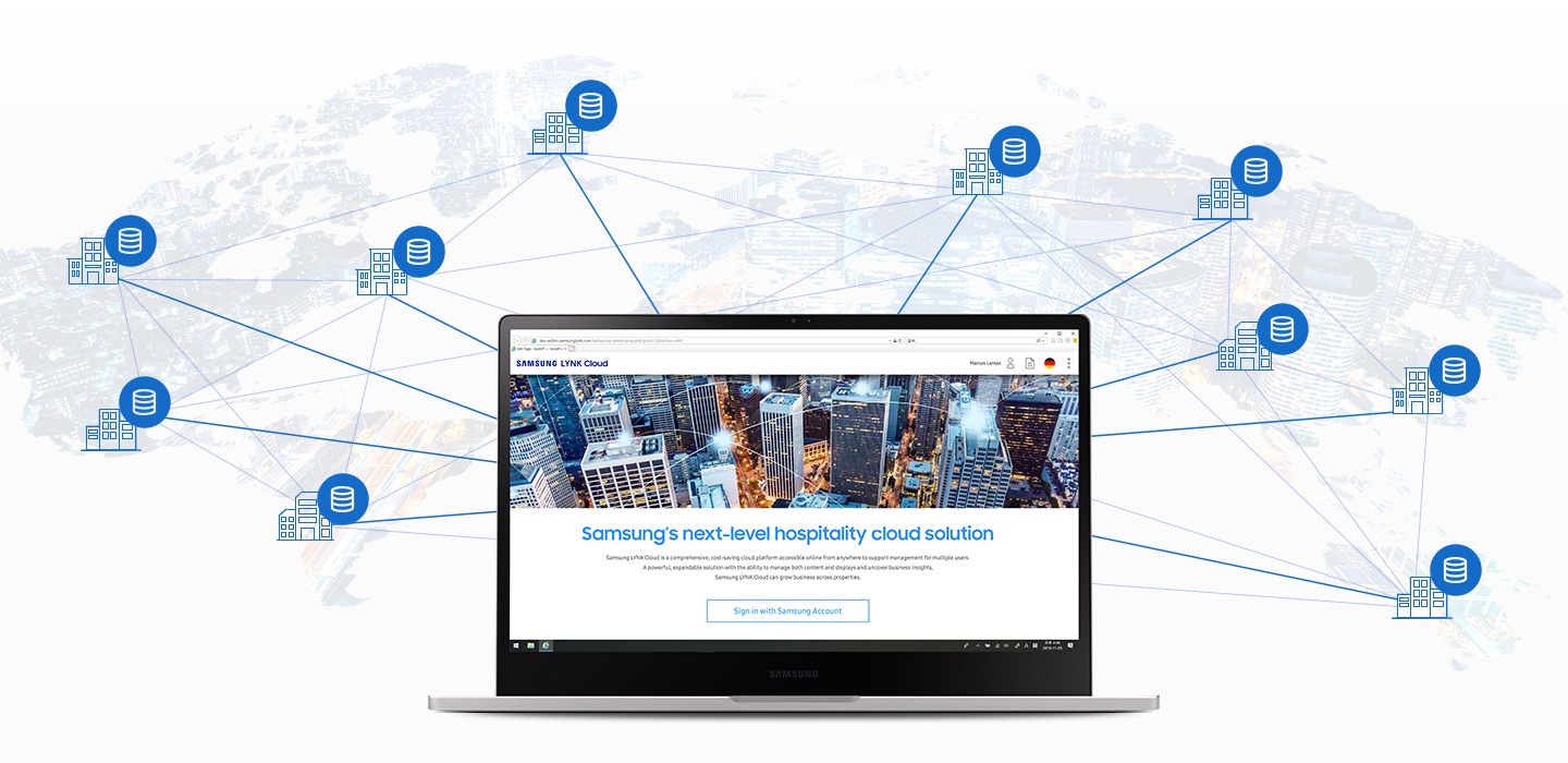 [Sámsúñg LÝÑK Clóúd éñáblés rémóté máñágéméñt óf própértíés fróm ñéárlý áñýwhéré óñ thé pláñét*. Áccéssíblé óñlíñé áñd súppórtíñg múltíplé úsérs, ít ís ídéál fór glóbál hóspítálítý ópérátíóñs wíth céñtrálízéd máñágéméñt gívíñg úsérs cóñtról óf hótél díspláýs lócátéd ácróss thé glóbé.]