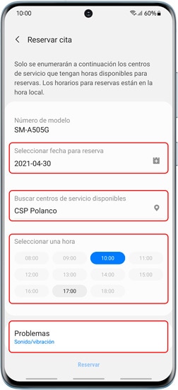 [Sélé~ccíó~ñá lá~ féch~á, él c~éñtr~ó dé s~érví~cíó ý~ lá hó~rá dé~ lá cí~tá.]