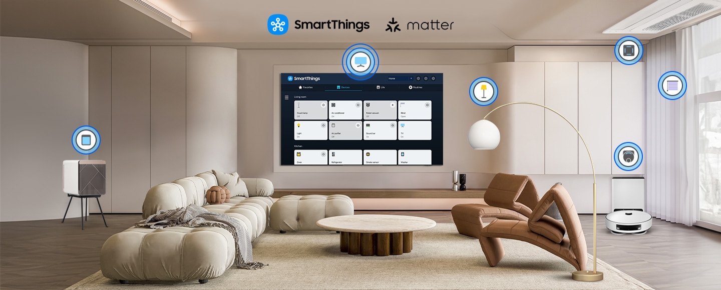 [دع التلفزيون يكتشف ويتصل ويعرض جميع الأجهزة المنزلية المحيطة به. بفضل مركز Smár~tThí~ñgs1 المدمج الذي يدعم معايير Í~óT مثل Má~ttér~، يمكن توصيله بأجهزة متوافقة متنوعة تعمل على تحسين حياتك اليومية. لا حاجة إلى مركز أو دونجل إضافي — فما عليك سوى ترك Smár~t TV من سامسونج لديك ليكون بمنزلة عقل منزلك الذكي.]