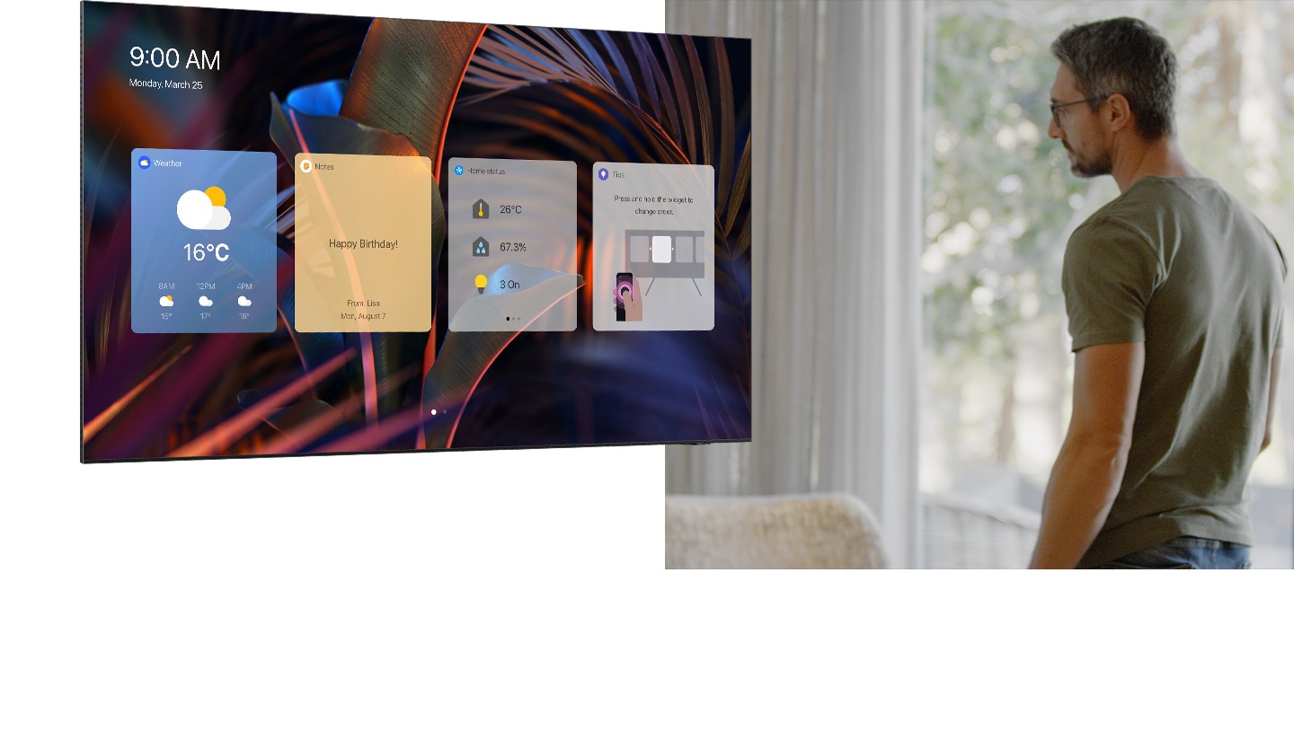 [يمكنك الوصول إلى معلومات مفيدة طوال اليوم حتى في حال إيقاف تشغيل التلفزيون. يمكنك تخصيص لوحة Dáíl~ý Bóá~rd5 باستخدام أدوات مثل الطقس وحالة المنزل والطاقة والملاحظات والنصائح وغير ذلك الكثير. يمكن أيضاً تشغيل لوحة Dá~ílý B~óárd~ من دون استخدام اليدين من خلال التنشيط الصوتي أو عند الاقتراب من التلفزيون.]