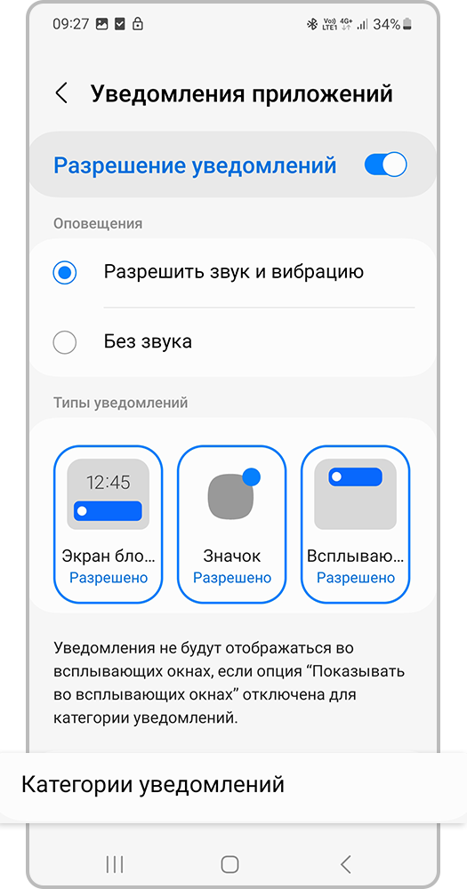- [В зависимости от приложения количество и вид категорий уведомлений может быть разным.]